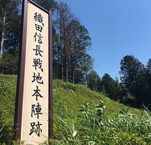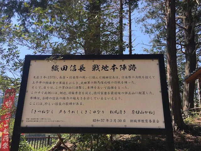 さらに織田信長本陣の跡地がすぐ目の前にありPAから階段を上って本陣跡地に行くことができます。思いのほか小さなスペースでしたがあの信長が、居たであろう場所に同じ場所に立っている自分に身震いしました。この小高いところから信長も周囲を見おろしていたのでしょうか。本陣跡に行く階段の前には武田軍の騎馬隊の進撃を阻止するための馬防柵も展示。その大きさは結構な高さ。これは馬も飛び越えられなさそうです。