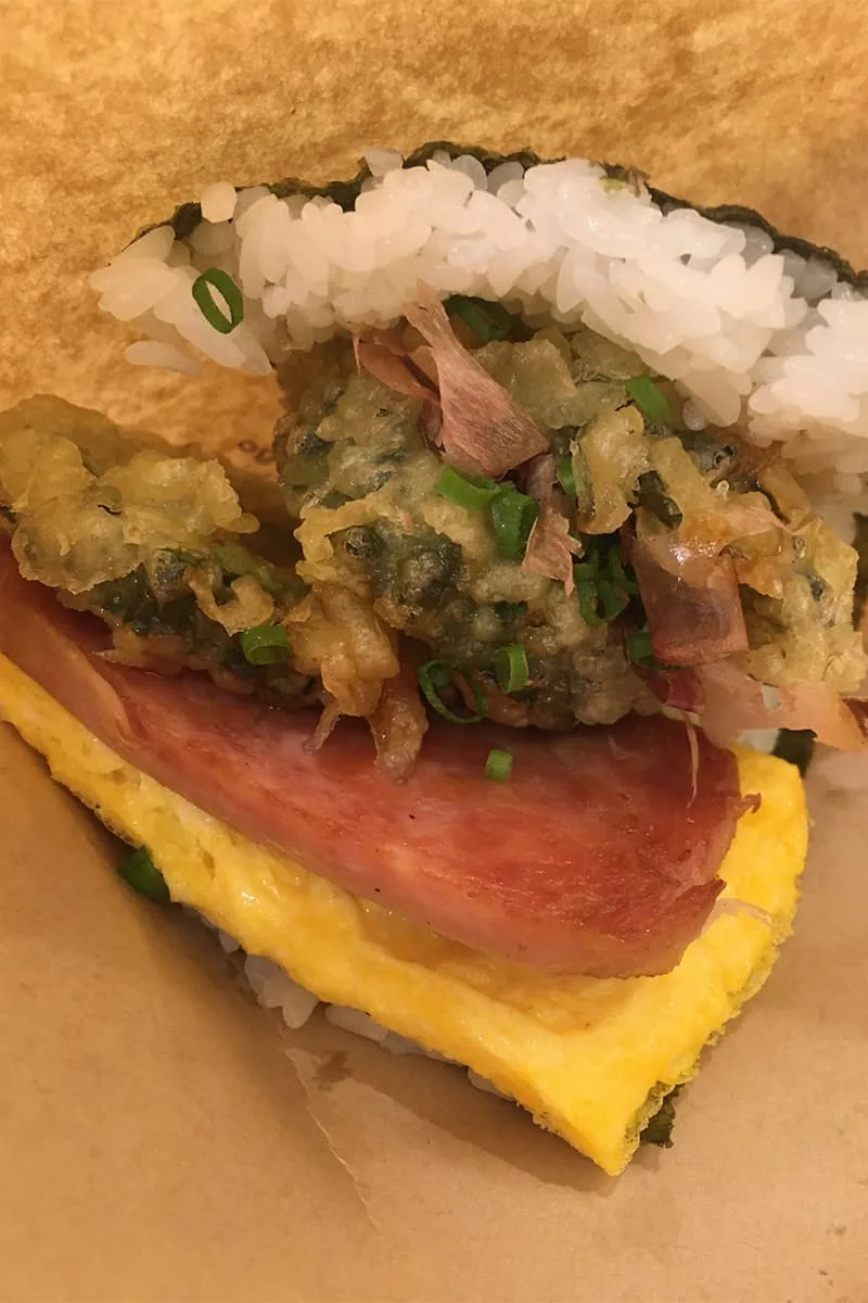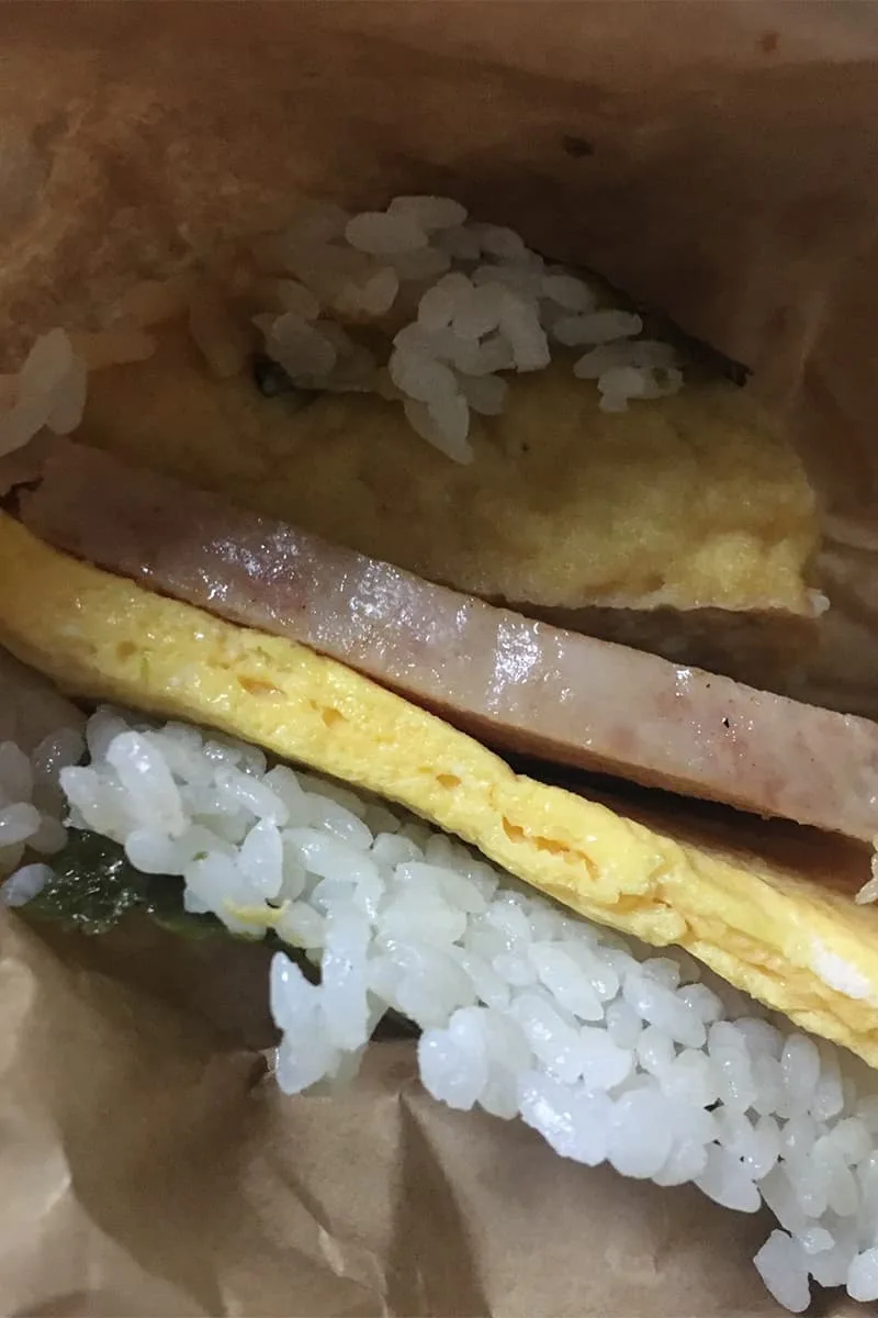 スパムとたまごを挟んだおにぎりです。このお店が結構並んでいて大人気。