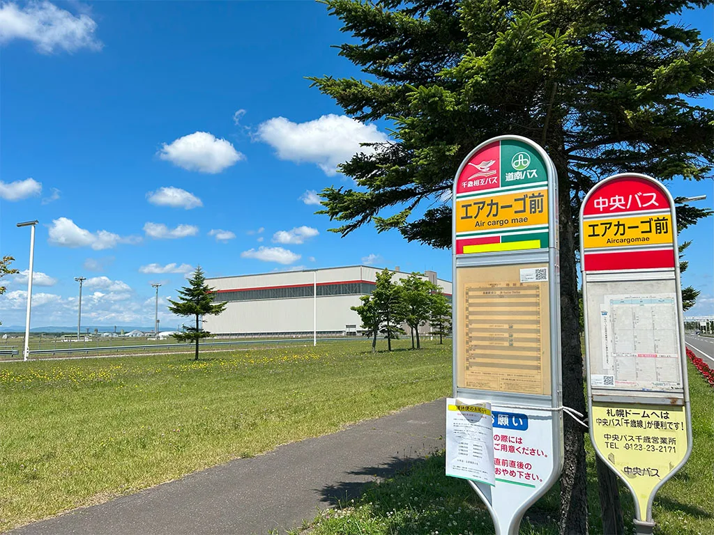 バスは本数少なめですが新千歳空港28番バス乗り場から「エアカーゴ前」バス停まで10分くらいで到着。バス料金100円