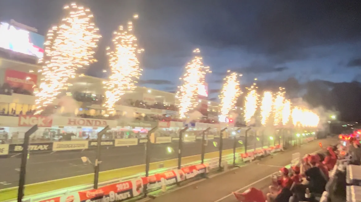 そして8時間が経ちチェッカーフラッグが振られゴールするとコースサイドからマシンの走る方向に合わせて順順に花火が!!