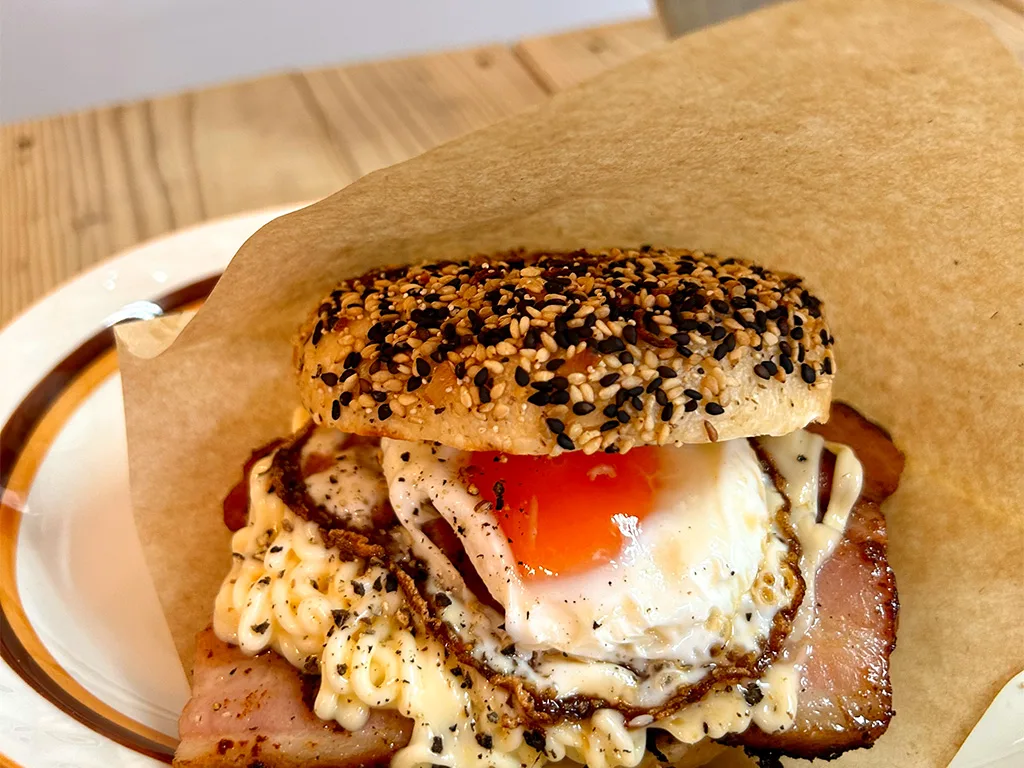 厚切りのベーコンにとろりとした黄身の目玉焼きが胡麻たっぷりのベーグルにはさまり、、、きってない笑。
