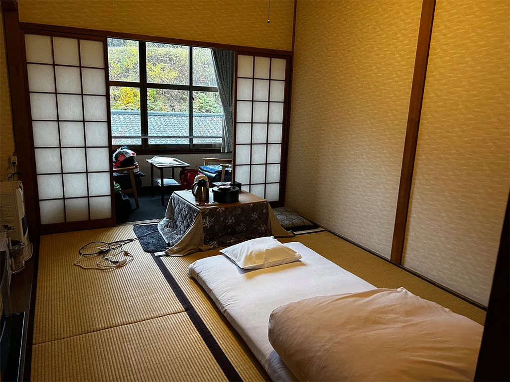 畳のお部屋にはお布団が敷かれコタツと暖房器具が配備
