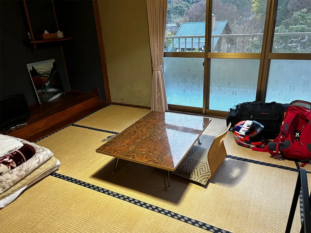 6畳の和室には小さなテーブルと座椅子と布団が置かれていました。