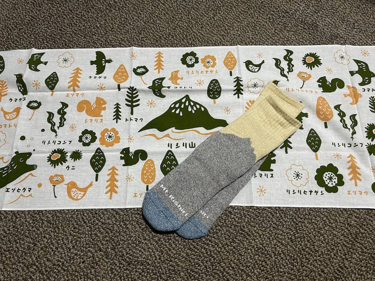 鴛泊フェリーターミナルに利尻山が描かれた靴下などが売っていて