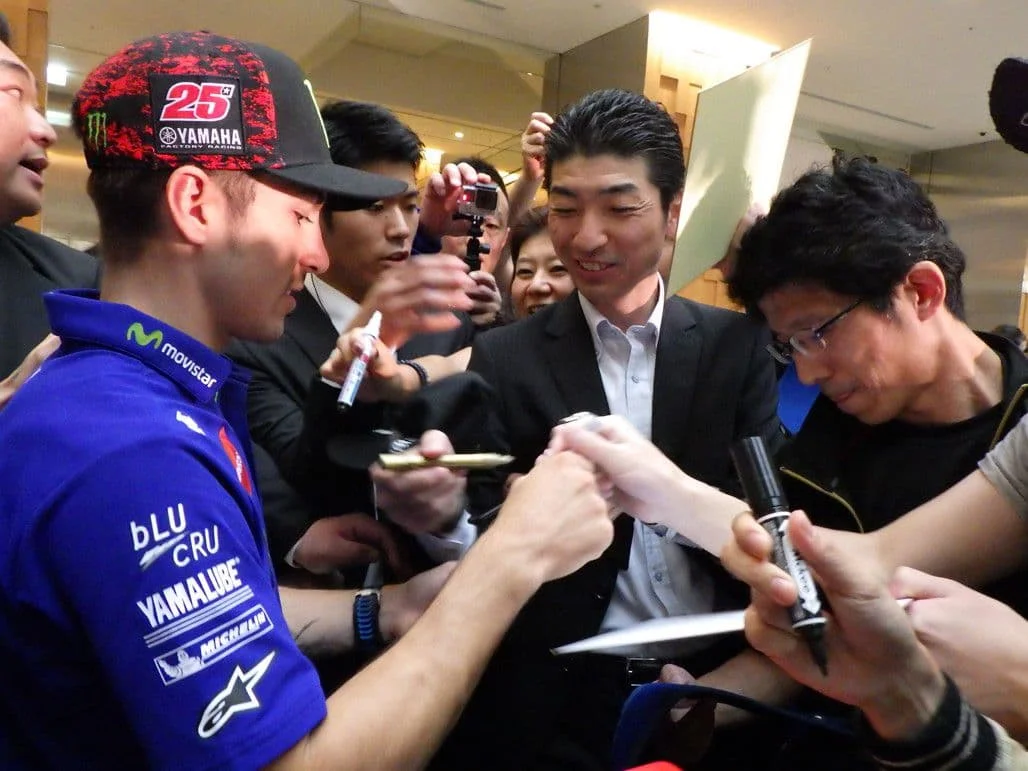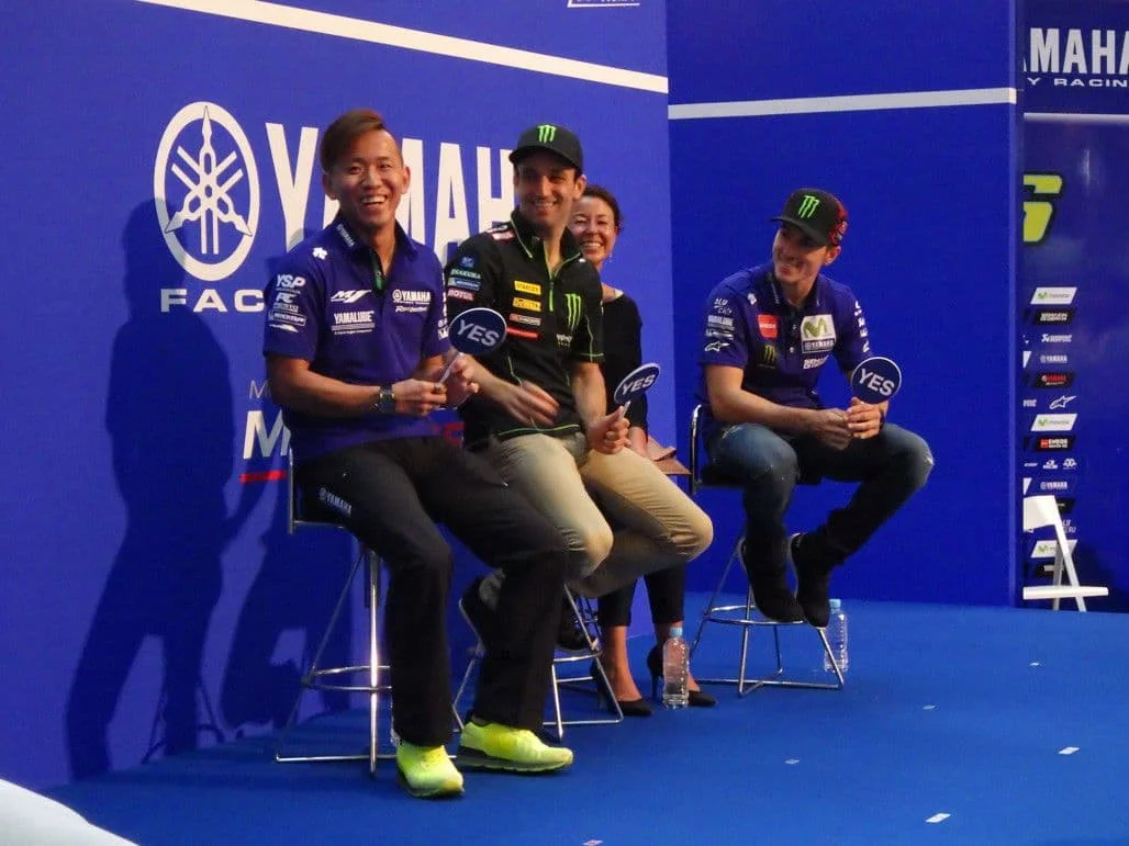 ヤマハは、マーヴェリック・ヴィニャーレス選手、ヨハン・ザルコ選手。鈴鹿8耐で優勝し、日本GPスポット参戦する中須賀克行選手が登壇。モトGPマシンの「M1」も展示していました。