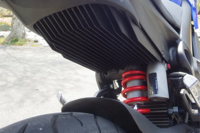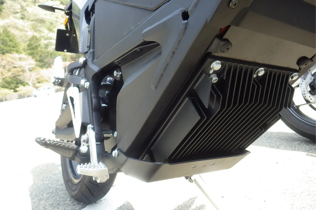 モタードは車高が高いため、重いコントローラはバッテリーの下側にに配置して低重心化されている。ここなら走行風でダイレクトに冷やされるしね!