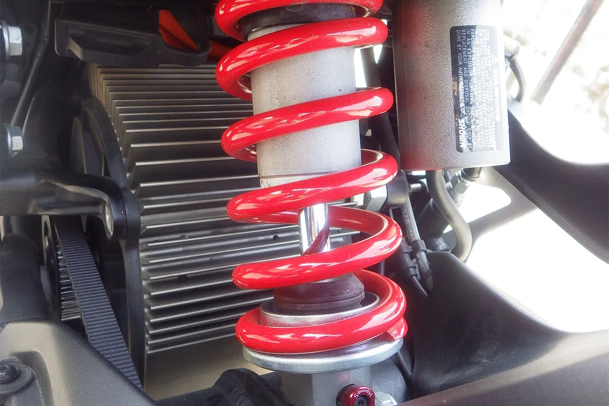 タンク部下の黒い大きなBOXの中に、14.4kWhを誇る大容量バッテリーが収められている。バッテリーを多く積んでいるため車両重量が188kgと少し重いが、最大トルクはリッターマシン並みの157Nm、最高速164km/h、カタログ上の最大航続距離288kmの高スペックなネイキッドスポーツだ。前後サスはショーワ製で、車重とマシンパワーにマッチする様に、専用設計されている。