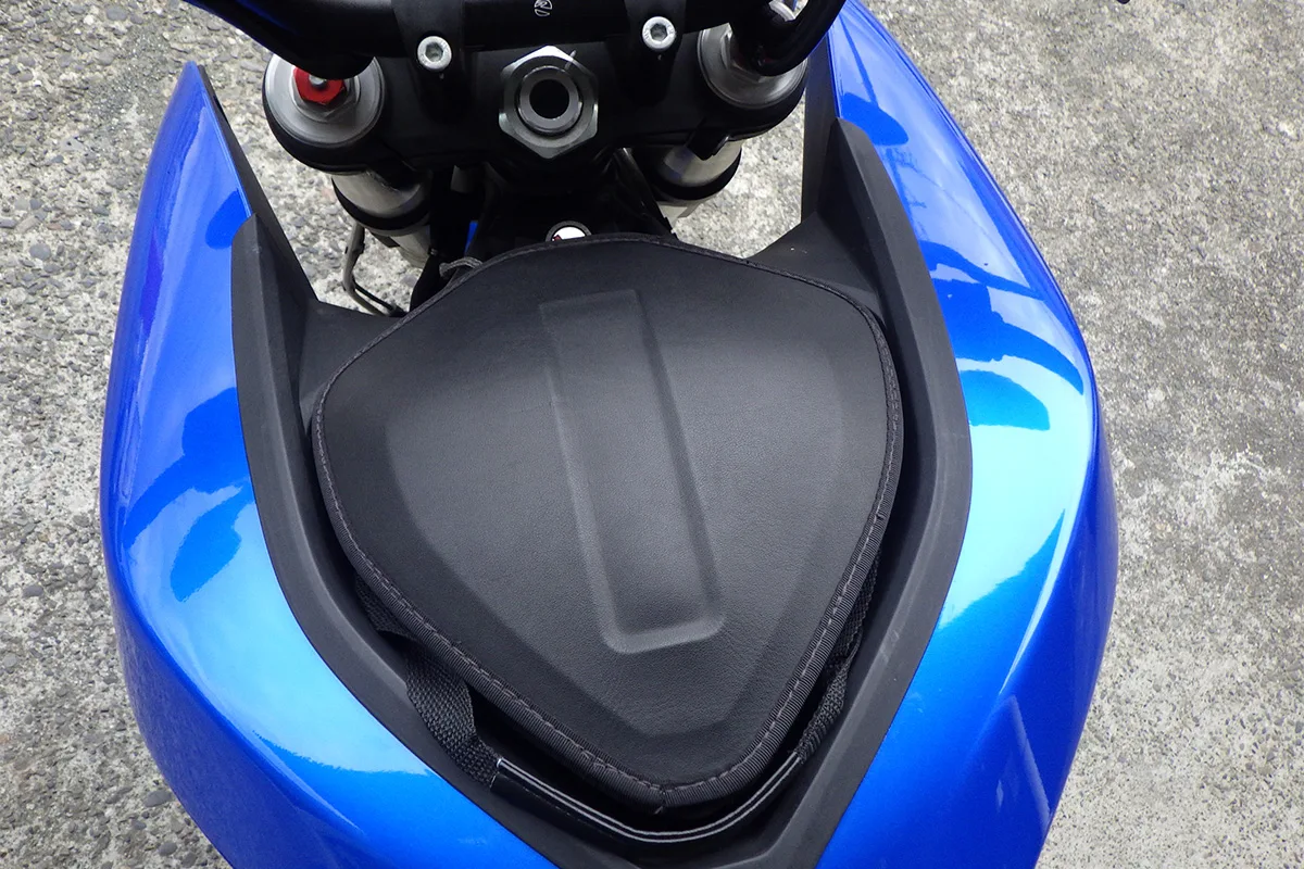 ガソリンタンクに相当する部分は、収納BOX。ファスナーで開閉でき、500㏄のペットボトル3本が余裕で入るので、ツーリング時にとても重宝した。