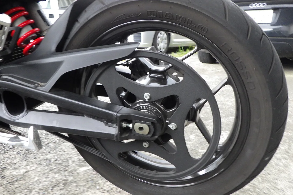 SRとFXSには共通点も多い。その1つがベルト駆動だ。とても静かでスロットルに対してのレスポンスも良い。そして車種毎に専用設計されたショーワ製の前後サスペンション。メーターも共通で、走行モードは「エコ」「スポーツ」「オリジナル設定」もできる。デジタルメーターには、バッテリ残量や消費電力、モーター回転数、モーター温度、回生ブレーキがどの位働いているのか…も表示される。