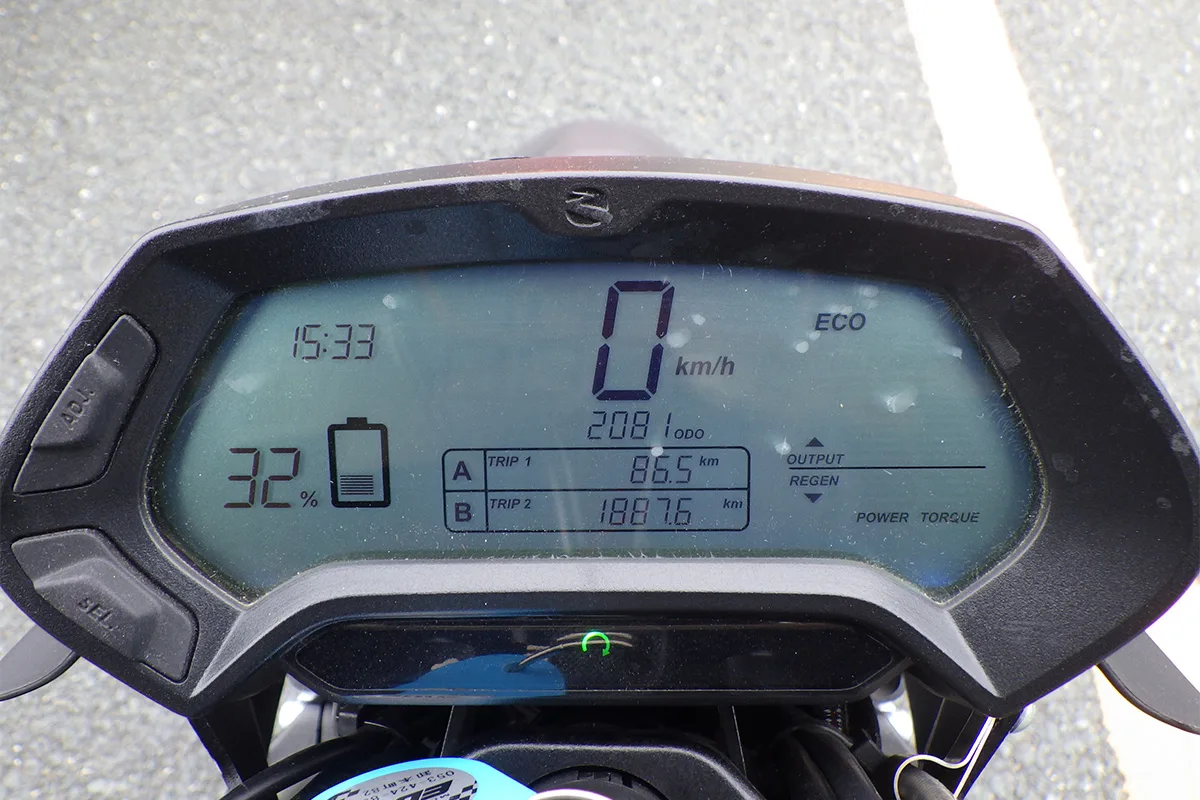 一般的な250ccのモタードとほぼ同じでとても乗り易い。最大トルクが106Nmもあり、ワインデングでも、軽くて速くてヒラヒラを楽しく操れる。カタログ上では最大航続距離が161kmだが、実際には、加速感も楽しいバイクなので、つい開けて走りがち。但し、ガンガン走ると航続距離は短くなる。