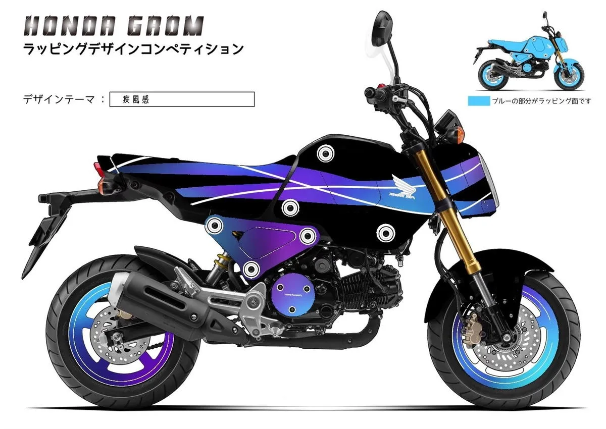 グロム・デザインコンテストを主催したのは、静岡県東部地域の高校生たちが中心に活動する課外クラブ「原動機研究部」。タレントの大槻ひびきさんから贈られたホンダグロムを「もっと多くの方がバイクに触れる機会」に活用したいという思いから端を発したこのコンテストには、 8つの高校から50人が参加し、自由な発想を生かした今風な作品の数々が寄せられた。