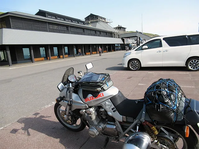 留萌の小平町にある道の駅おびら鰊番屋に建家は漆黒をベースにしたシブいもの。絵的にカタナとマッチすると思い、愛車のカタナを入れてシャッターを押した。