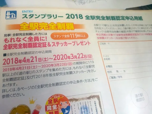 このスタンプラリーを始めるには、最初に訪れた道の駅でスタンプラリー参加料を兼ねた「スタンプブック」なるものを税込200円(2019年現在)で購入する。そして、スタンプブックの指定されたページに訪れた”道の駅”のスタンプを押印していく(他の用紙や切り貼りは不可)というもの。ただし、このスタンプは道の駅の開館時間内(開館時間や休館日は各駅で異なるのでスタンプラリー帳で要確認)にしか押印することができないので、早朝や夜間に訪れた際には残念ながらスタンプはゲットできない…。(以前は、閉館していても道の駅が分かる場所で撮影した写真を添付すればスタンプと同等と認められたのだが。。。参加者が多くなってしまい処理しきれなくなったのだろうか…。残念!)