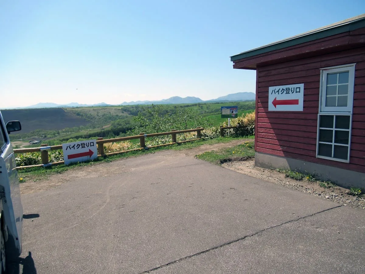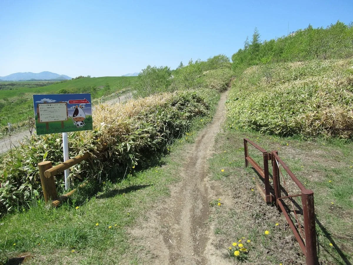 開陽台からのパノラマを充分堪能したあと、展望台から降りてトイレ脇をのぞくと、展望台脇のキャンプ場が「ウシ空のキャンプ場」という名称であることを書かれた看板を発見! さらに、ライダー向けのキャンプ場であることも判明した。やはり、以前と同じように無料(というか、以前は特にキャンプ場という認識はなく、勝手に野宿していたライダーがいたというような雰囲気だったが…)で使える。ただ、このキャンプ場への入口となるアプローチ道は、シングルトラックの未舗装路、両側には熊笹が生い茂っているため、オフロード車なら躊躇なく入っていけるがロードモデルだとちょっと二の足を踏んでしまうかもしれない。この写真を撮影したのは5月で、ライダーたちのオンシーズン(7〜8月)ではなかったため、まだ整備するまえだったのかもしれないが…。
