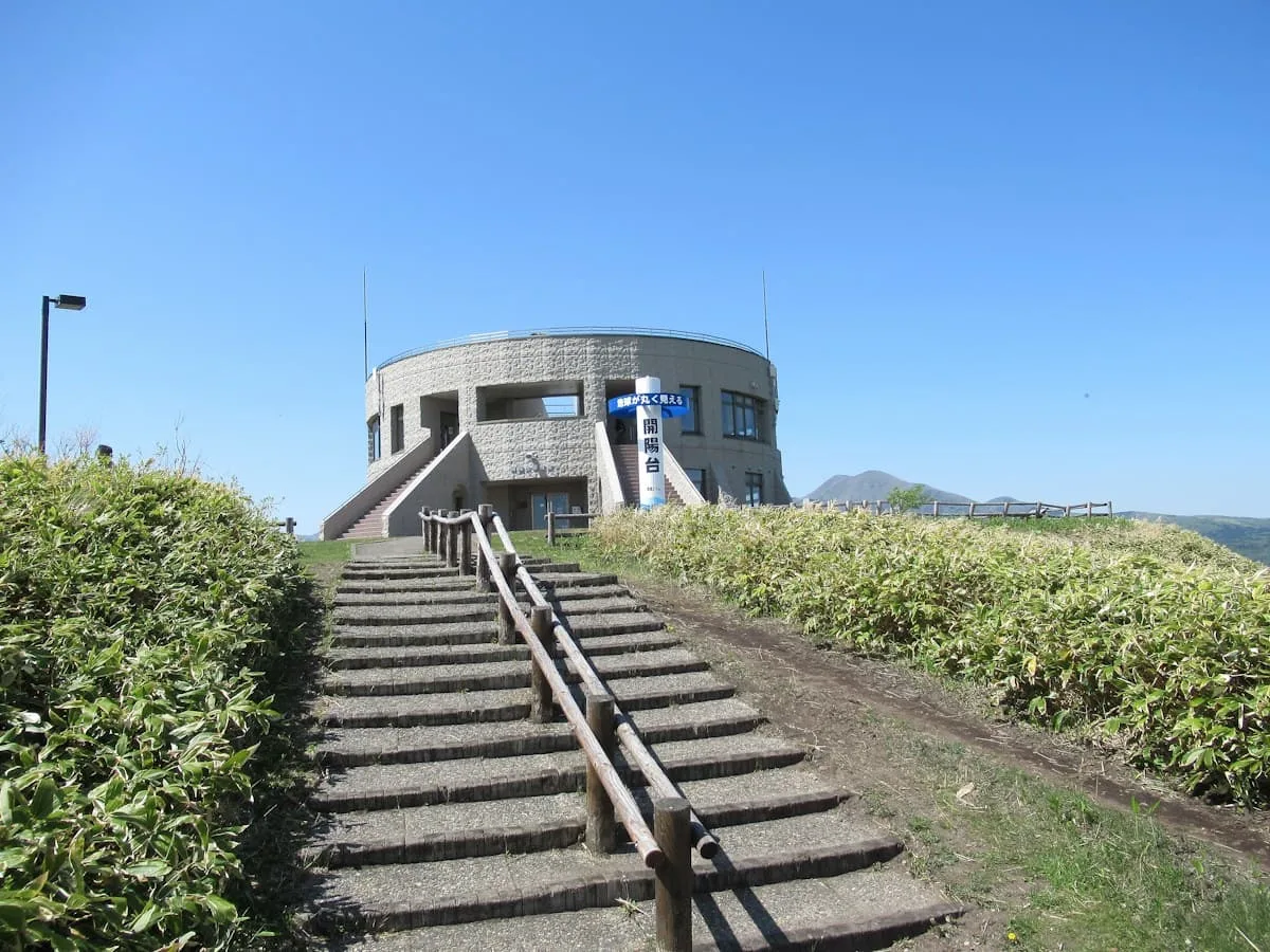 「地球が丸く見える」というキャッチフレーズが書かれた塔の奥にある「開陽台展望館」の屋上が展望台となっている。