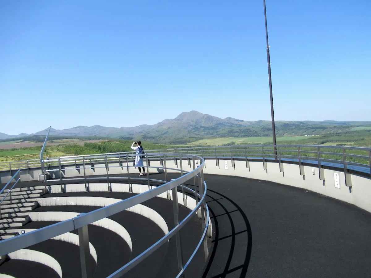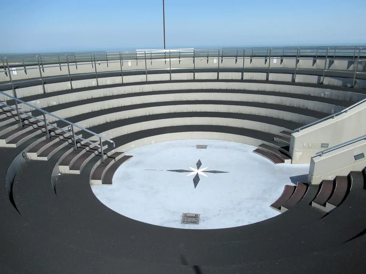 展望台から駐車場方面を見て見ると、水平線がはるか遠くに見える。この景色が360度展開されているので、円形の展望台を何度もグルグル回ってみたくなる。展望台は円形劇場のような作りになっており、ミニコンサートでもできそう。