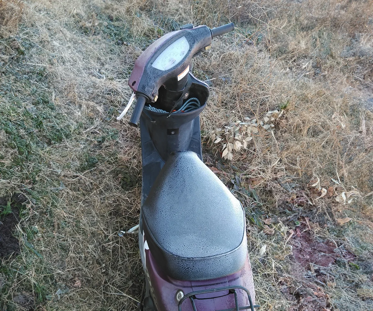 翌朝、朝一の90分クラスがスタートするころにガサガサと起き出して、外に置いたディオを見て見ると、シートや外装が真っ白! 凍っている…。