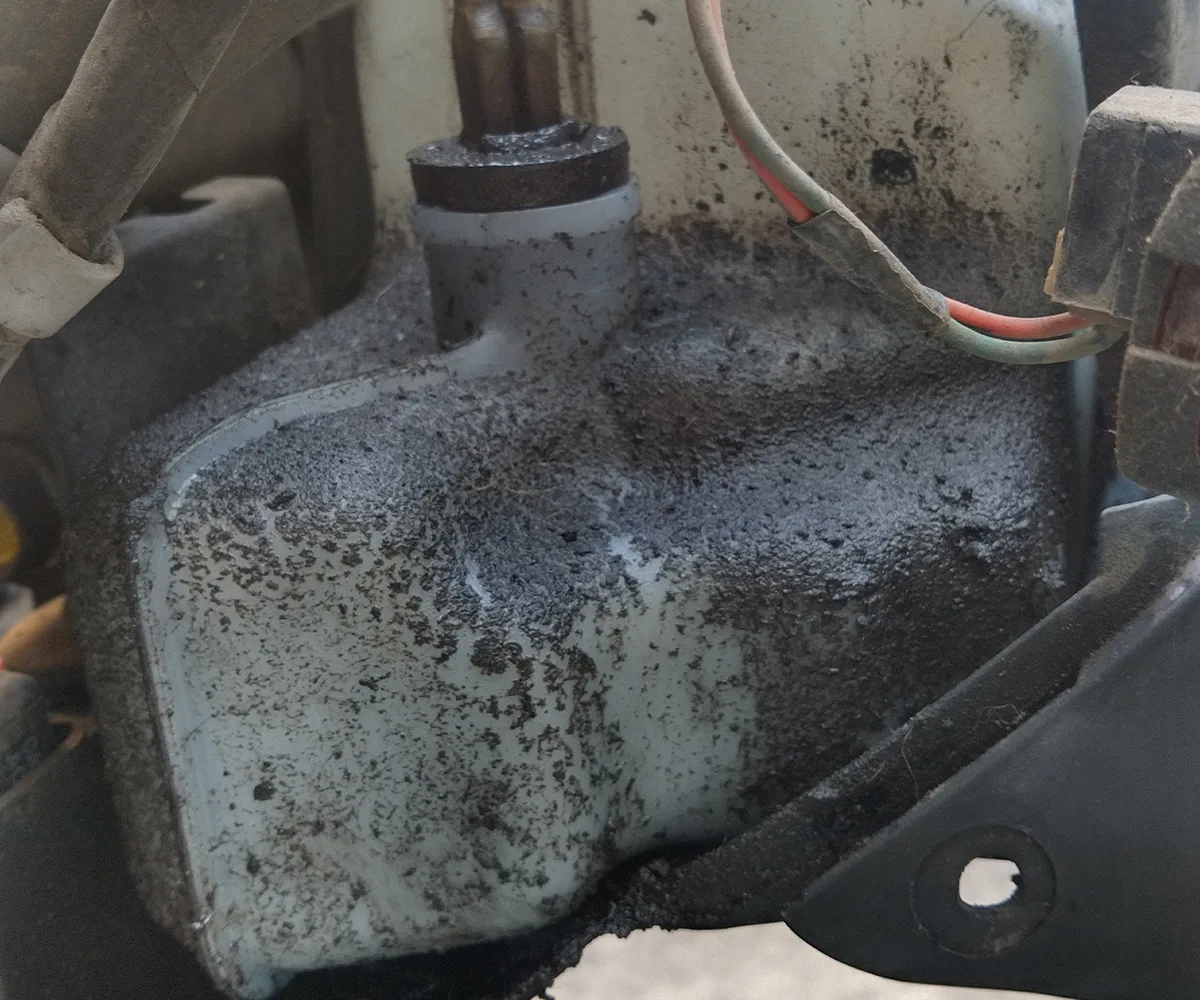 さらになぜかお漏らしをしている。凍っていることは理解できたが、お漏らしは??? ガソリン? いや、粘度がありそうだからオイル? ということで一瞬で目が覚めた。ペーパーウエスで拭って見ると青い! ということは、昨日満タンにしたエンジンオイルが漏れているということだ。オイルタンク付近を見てみると、オイル警告灯スイッチのフタから少しずつ漏れている。フタのパッキンが弱っているようだ。この場ではどうしようもできないので、車体に掛かったオイルをパーツクリーナー1本使って洗い流し、フタに応急処置をして様子をみることにした。