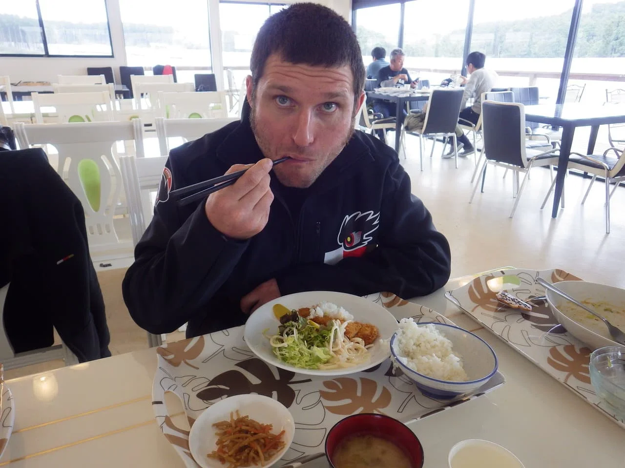 どんぶりのごはんを迷った挙句、”かつ”の上にかけて不思議な食べ方をしている、ガイ選手。