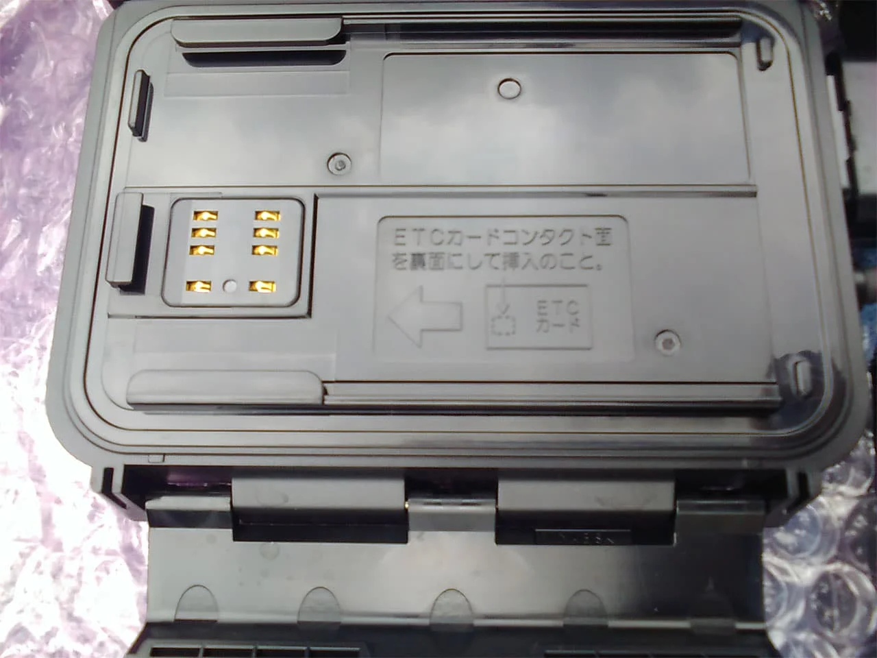 そおっとプチプチからだし、ふたを開ける。説明書き通りにカードを裏返して車載器にセットする。ふたをして、プチプチに入れて、ウエスに乗せて、シートを閉める
