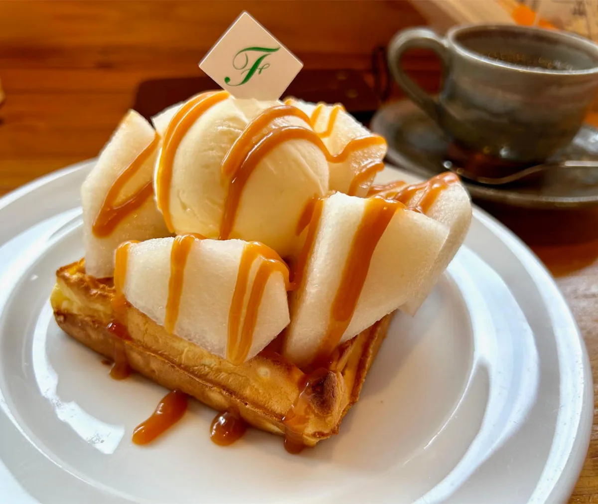 梨いっぱいのワッフルを注文。