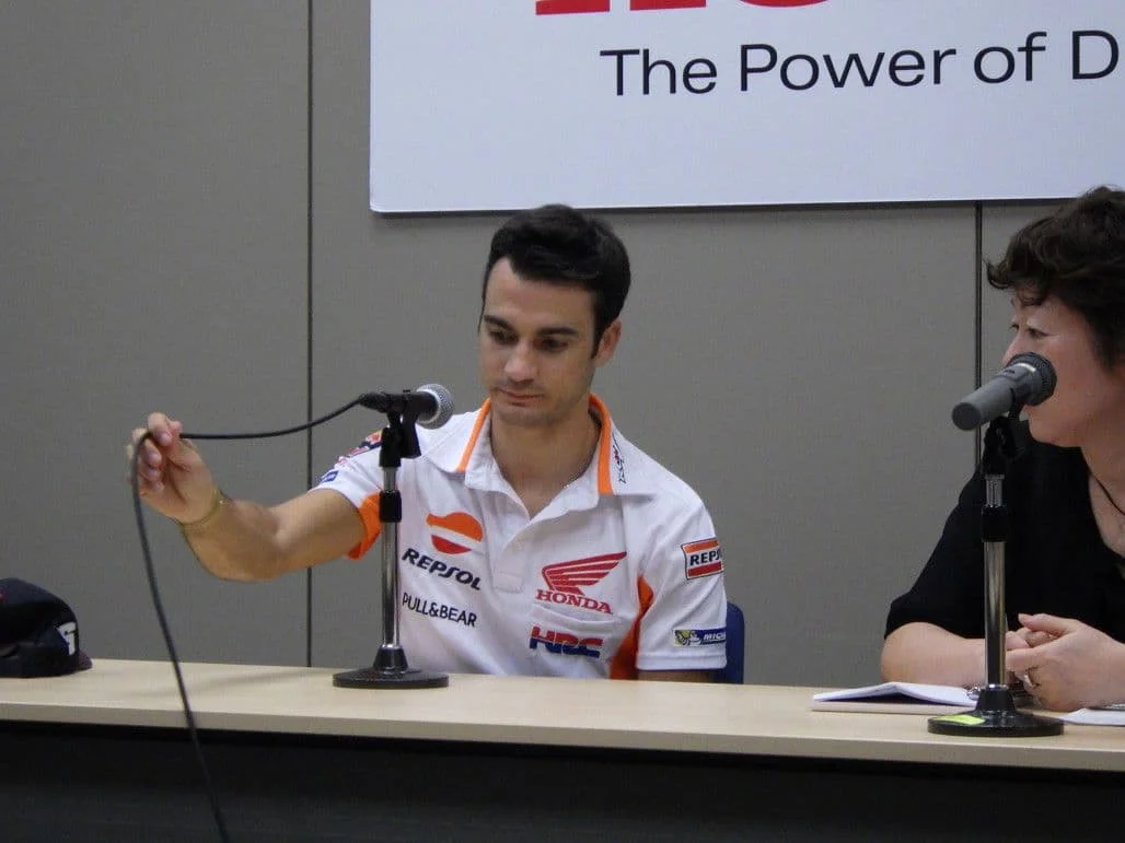 マルケス選手は笑顔があるのに、ペドロサはいつも硬い表情。 ホラ見て! メディア向けの記者会見の時だって、マイクのコードが気になっちゃうくらい、とっても神経質な性格なんだと思うよ!