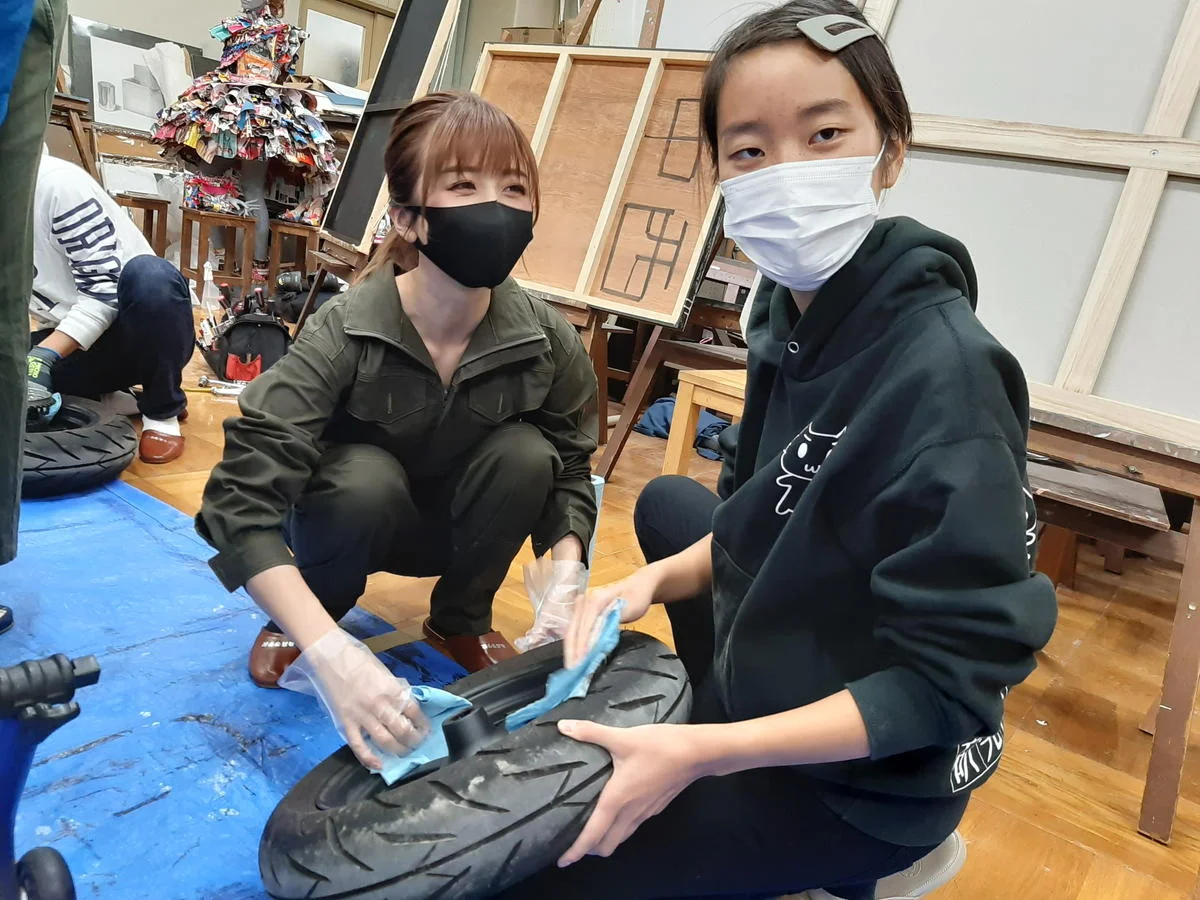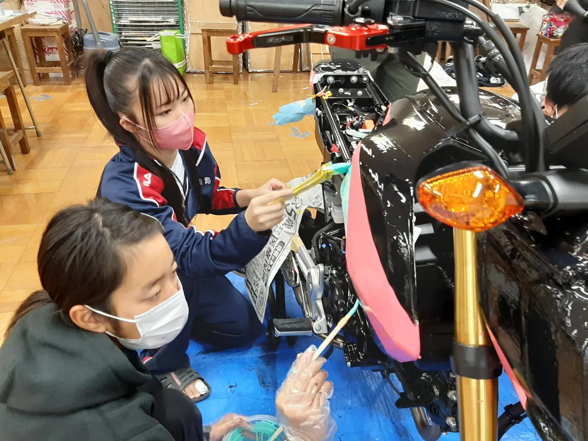 そして各部に塗料がのりやすいようにクリーナーで脱脂をする。高校生の西形さんが、大槻さんにコスメ情報やスキンケアの方法を訊ねたり、秘密の女子トークもしていて、地味な脱脂作業もなんだか楽しそうだ!