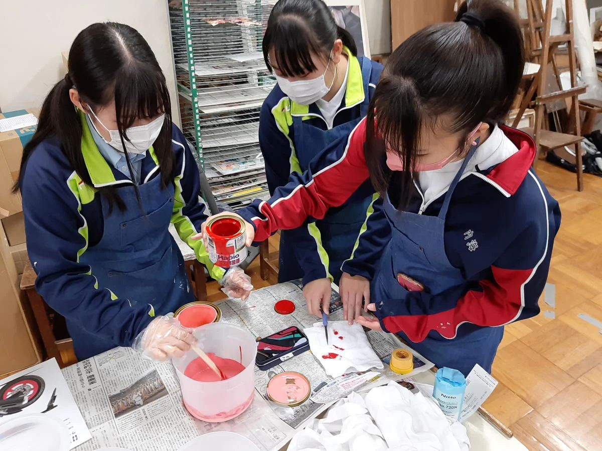美術工芸部の3人は、塗料を調合して赤と青緑のカラーをデザイン画の色に合わせる作業から開始する。水性アクリル塗料を扱うのが初めてとは思えないほど、3人の手際良く、さすが美術工芸部だ!