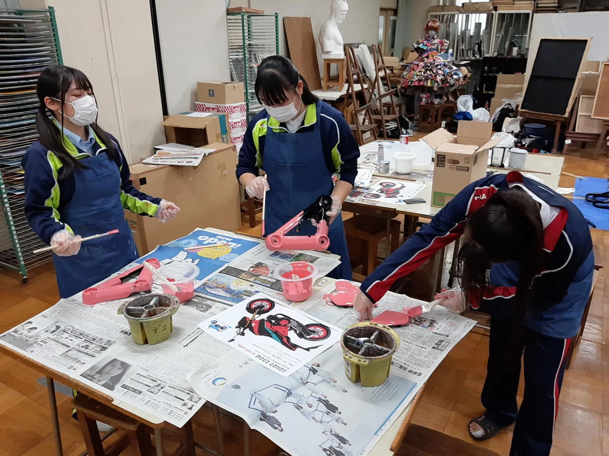美術工芸部の部員で一緒にコンテストに応募していた3年生の稗田真優(ひえだまゆ)さん、2年生の内海妃南(うちみひいな)さんも参加。そして創造デザイン科の教師の柴田寛志先生がアドバイザーとして作業を見守った。