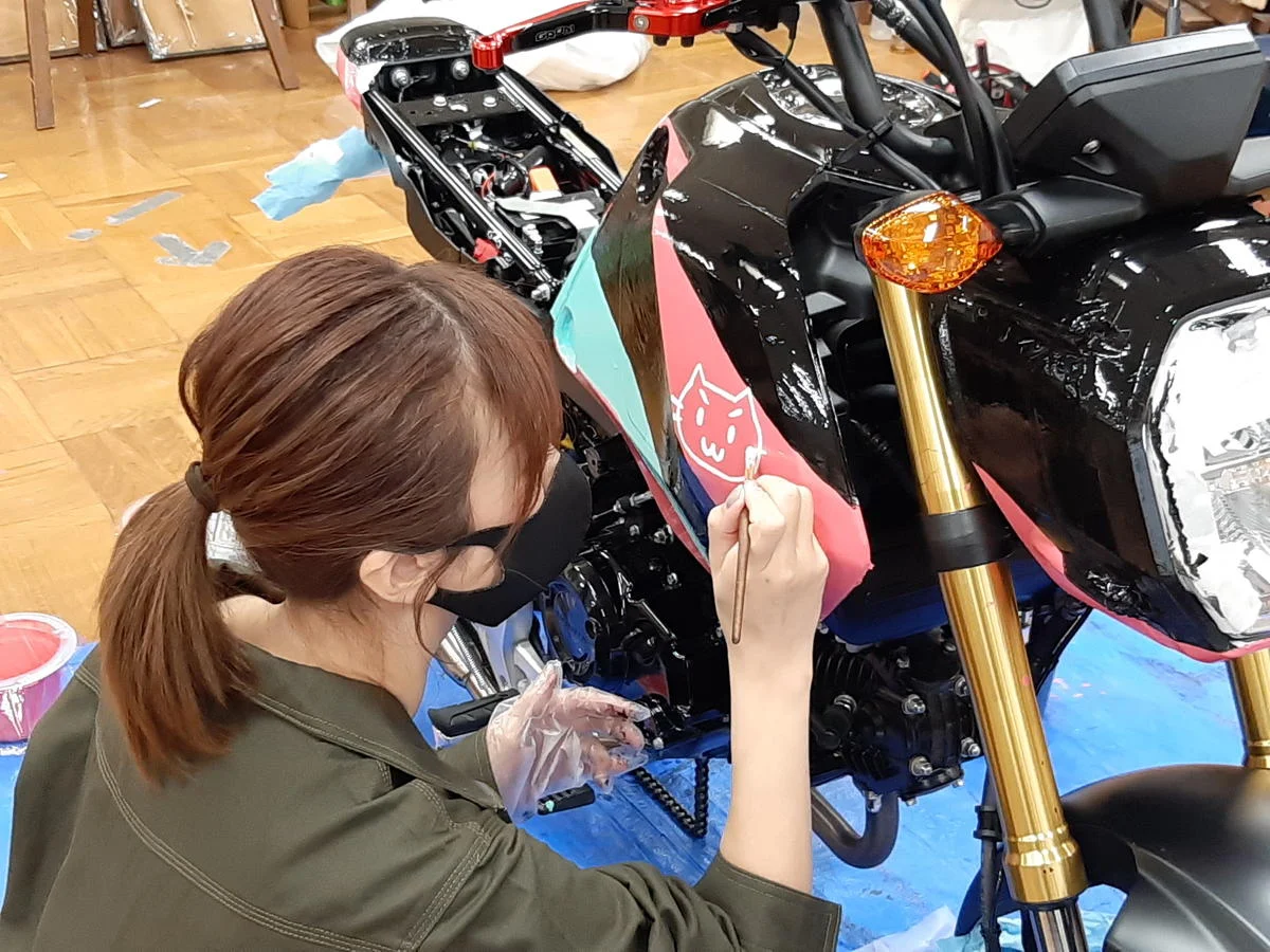 林さんがデザインしたカラーリングのポイントは「可愛くて目立つコト」。だが普段は平面的なイラスト作品が多く、立体作品を扱うのは殆ど初めて。ましてやバイクを塗ることも初めてで、バイクの樹脂パーツや金属、シートの素材に塗るのも初体験だという。それにバイクはけっこう凹凸や曲面があるから、実車に塗る際にはデザインの修正作業が必須になるらしい。
