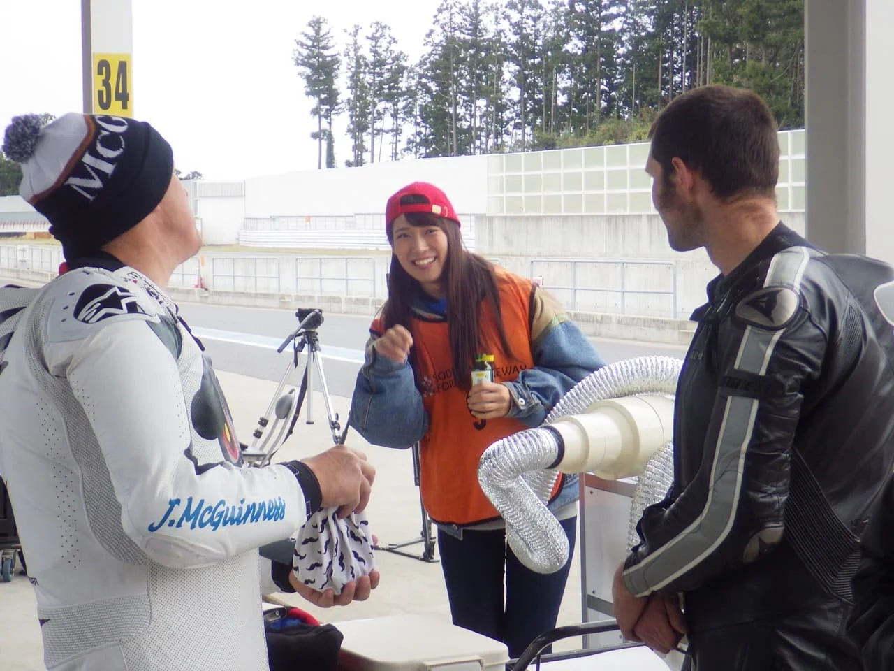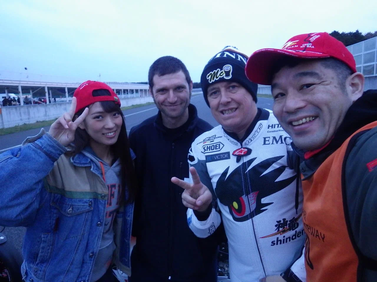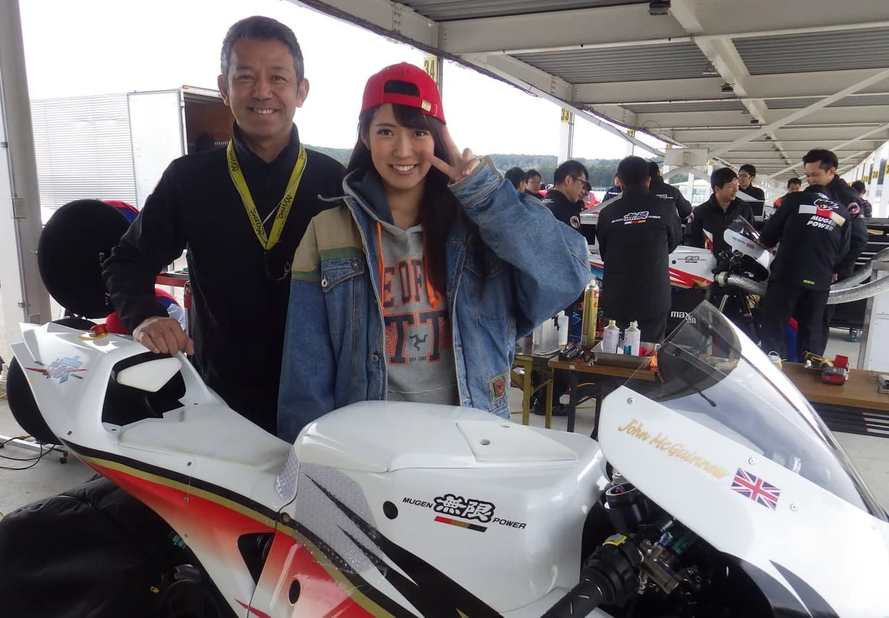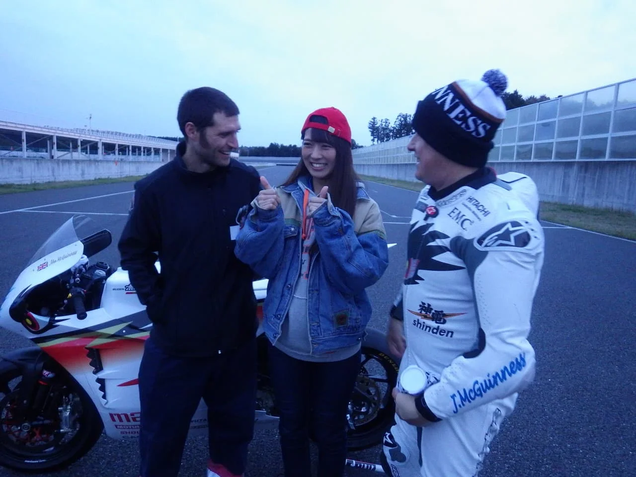 マン島TTのスター選手、ジョン・マクギネス選手(ボクの隣り)、マン島TTのドキュメンタリー映画『CLOSER TO THE EDGE マン島TTライダー』で主人公となったガイ・マーチン選手が、イギリスから来日してのテスト走行に、事務所の後輩でバイク女子、モデルの"紗喜花"ちゃんも同行しました!