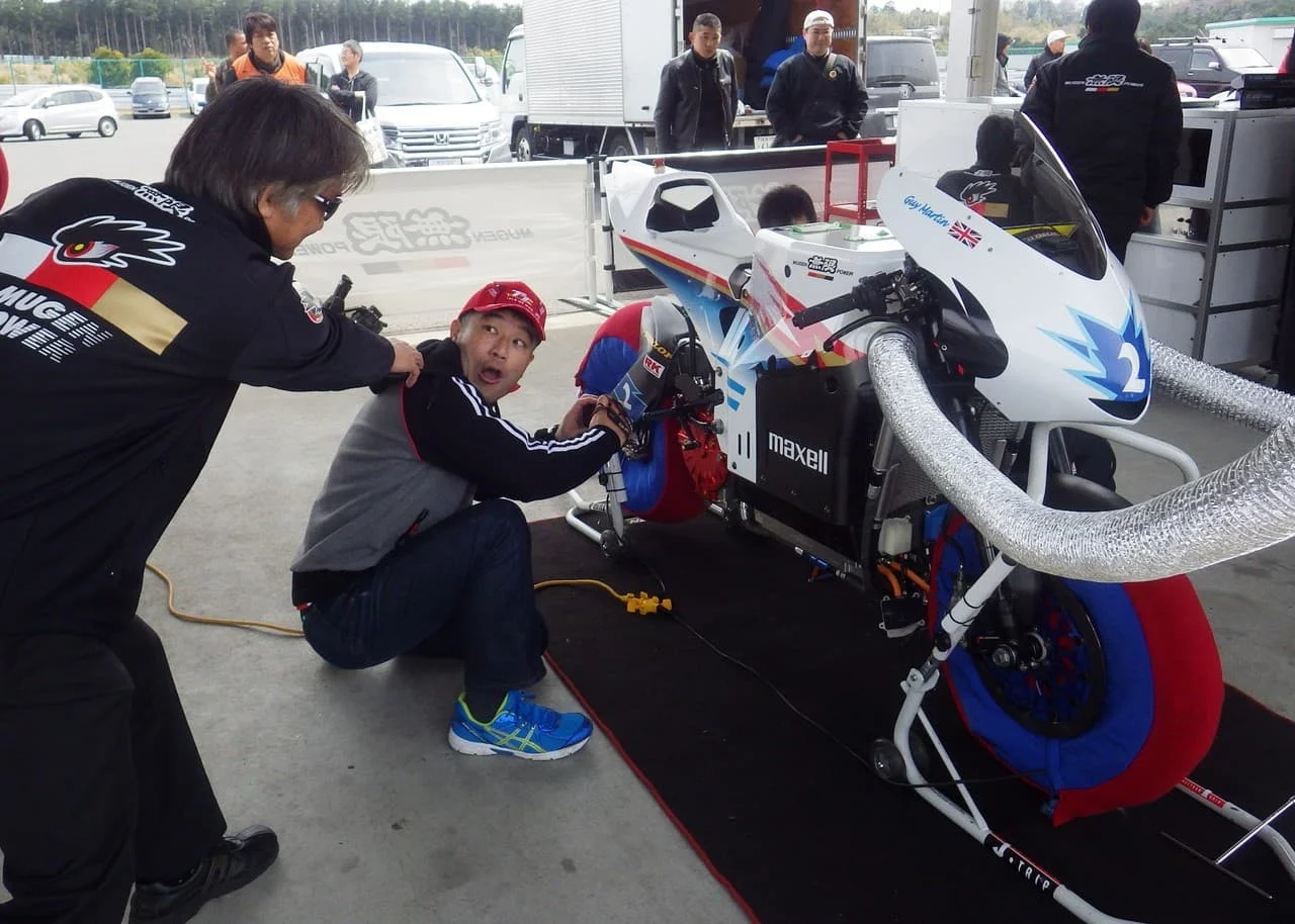 この日、無限の電動バイクに初めて乗った ガイ・マーチン選手は、「今まで乗った電動レーサーマシンの中で、一番速い」と、「神電六」を高評価。