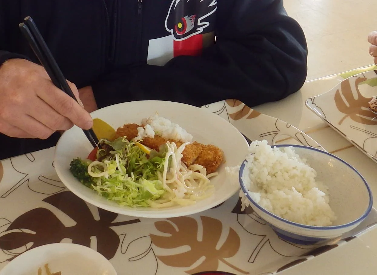 どんぶりのごはんを迷った挙句、”かつ”の上にかけて不思議な食べ方をしている、ガイ選手。