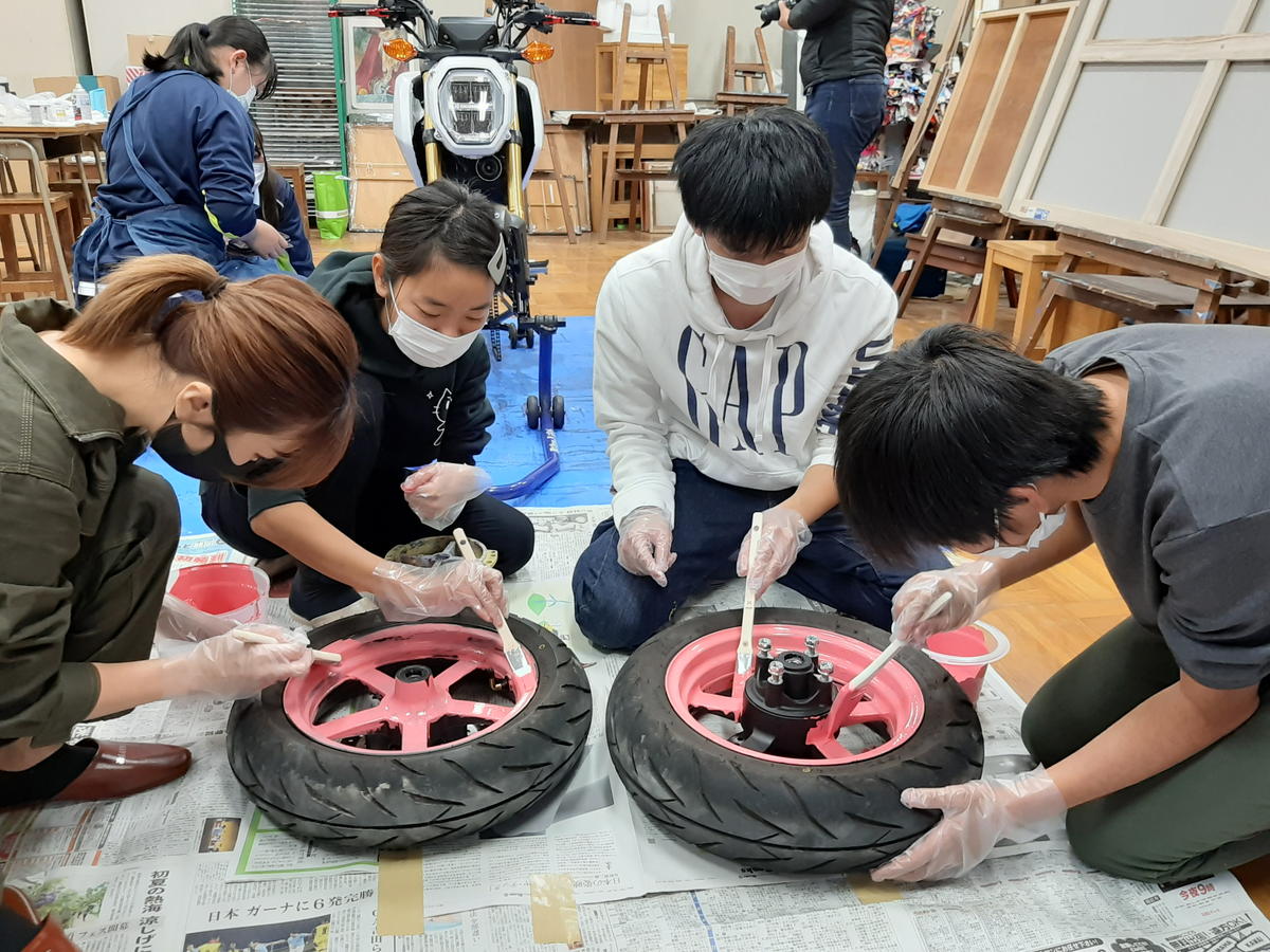 一方の原研チームは、外したタイヤのホイールに塗料を塗って行く。ホイールはその形状から白いラッピングが貼れなかったため、元の黒色塗装の上にピンク色を3回塗り重ねる作業となった。