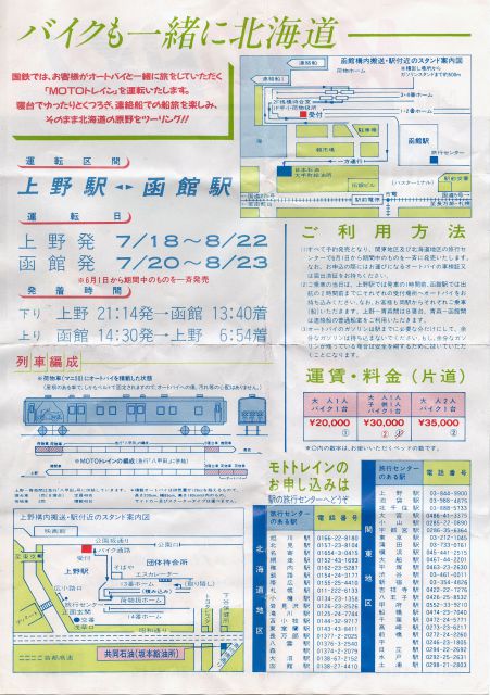 「モト・トレイン」の行程は夜9時過ぎに上野駅を出発、翌午前中に青森駅に到着しライダーは徒歩で青函連絡船に乗り込む。バイクは、貨物車に積まれたまま青函連絡船に積込まれる。そして、午後2時くらいに函館駅の荷物用ホーム(?)でバイクを受け取るというもので、フェリーよりも所要時間がだんぜん短く渡道する事ができた。さらに料金も良心的で、バイク1台とライダー1人で20,000円(当時、消費税はなかった)という破格の設定(個人的な感想デス。寝台車に乗れて、函館までバイクと一緒に移動できるなんて夢のような列車でしたから!)だった。これならば移動中に寝て、函館に着いた瞬間からツーリングに出発できるため、時間とお金の効率が一番良いと思い、主要駅にしかない“駅の旅行センター”で「モト・トレイン」の切符を購入した。