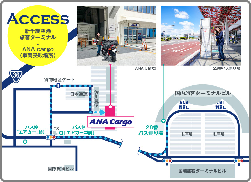 ENEOSのガソリンスタンドを右折し、奥のゲートから貨物地区に入ります。ゲートを抜けた右奥にあるANA Cargoの受付へ向かい、「バイクの引き取りに来た」旨をお伝えいただければ、愛車の受け取りが完了となります。バッテリープラグを接続し直し、荷物の準備が整ったらツーリングスタートです!